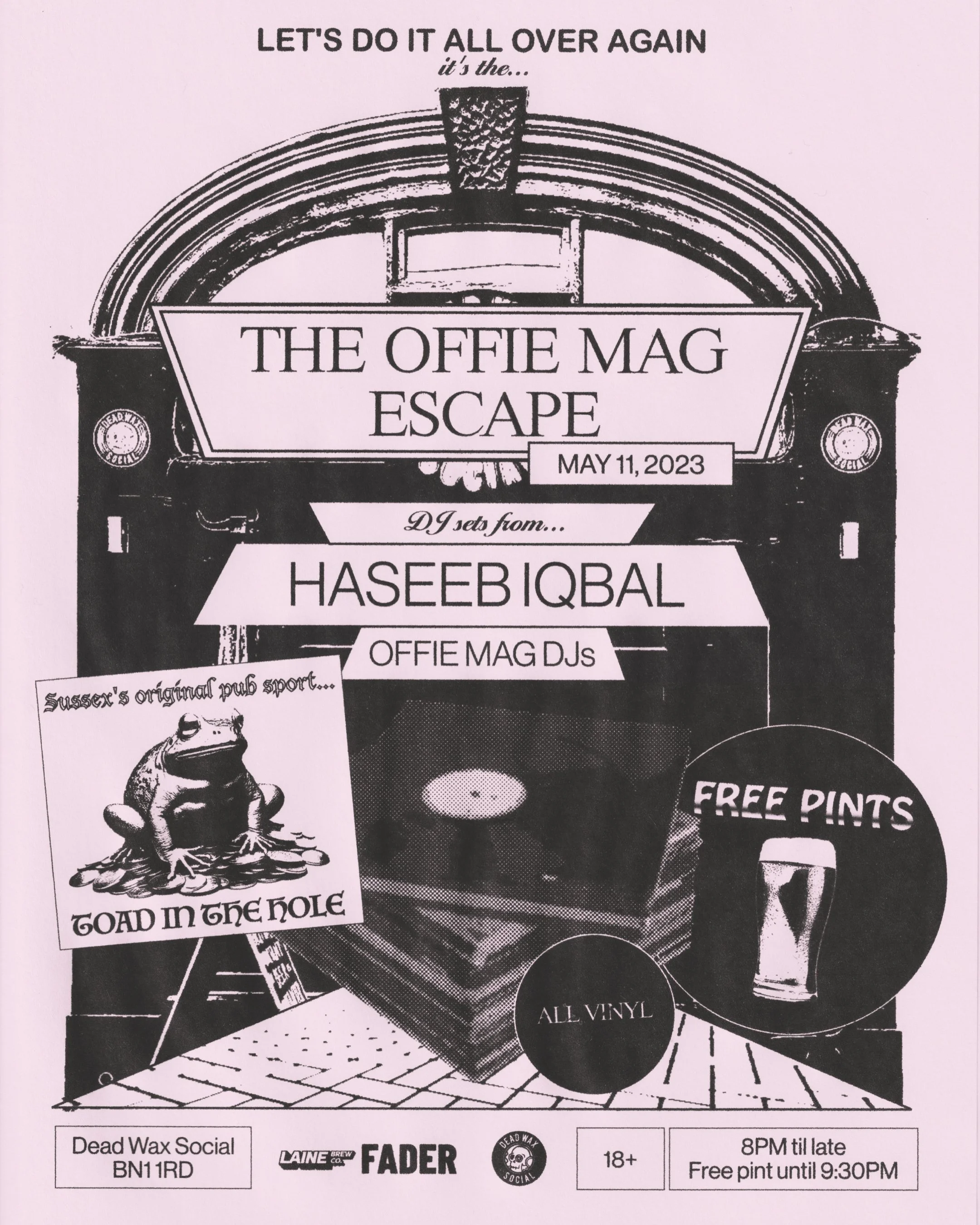 The Off License Magazine lot are back in the house with merch to sell, Toads to play, Haseeb Iqbal behind the decks… AND free Pints of Fader (One per entrant, whilst Stock lasts) Join us during the Great Escape week for what will be an INASNE night!!